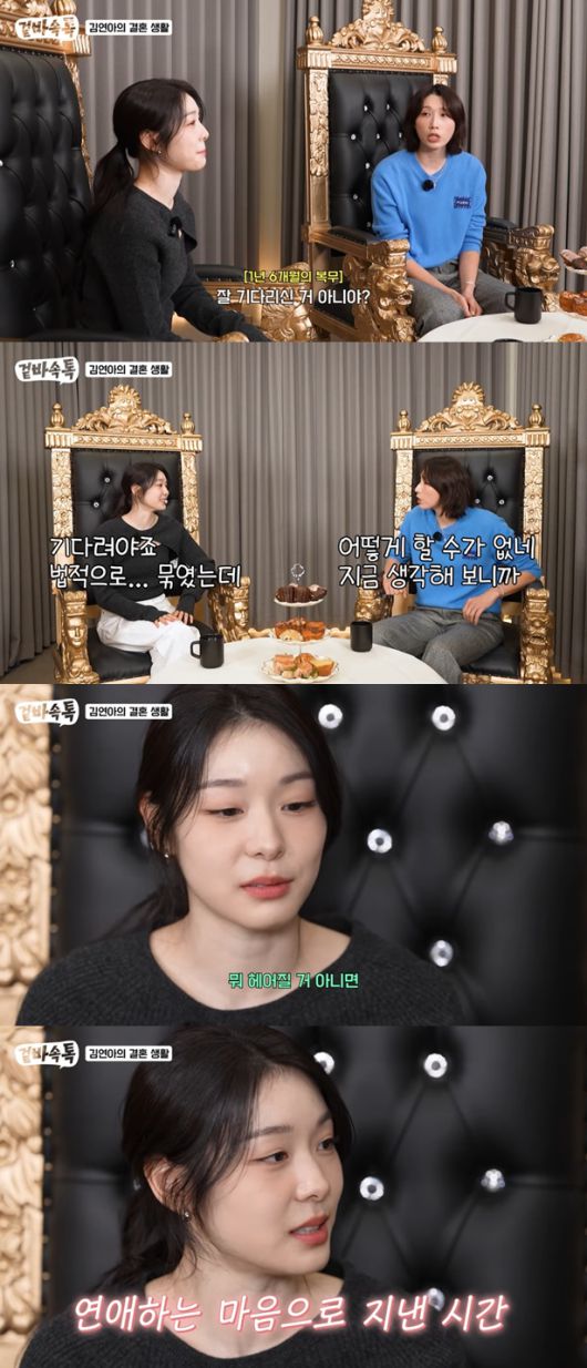 그러면서 김연아는 "결혼을 이미 했으니까 헤어질 거 아니면 기다린다는 말도 좀 웃긴게 중간중간 얼굴도 볼 수 있으니까 연애하는 마음으로 지냈던 것 같다"고 당시에 대해 설명했다.