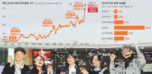 만년 저평가에 ‘국장 탈출은 지능순’이라는 비아냥까지 듣던 코스피 지수가 5000선을 찍으며 ‘가보지 않은 길’을 걷고 있다. 정부의 증시 정책과 실적 전망, 반도체와 로봇 등 인공지능(AI) 산업 영향에 더해 전 세계적인 유동성 공급이라는 ‘삼박자’가 복합적으로 작용한 결과다.