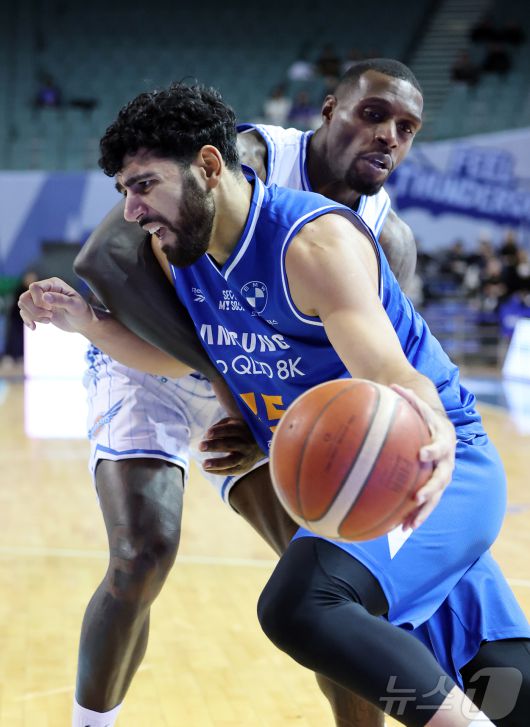 (서울=뉴스1) 김진환 기자 = 22일 오후 서울 송파구 잠실 잠실실내체육관에서 열린 2025-2026 LG전자 프로농구 정규리그 서울 삼성 썬더스와 대구 한국가스공사의 경기, 3쿼터 삼성 칸터가 한국가스공사 라건아 수비 앞으로 돌파하고 있다. 2026.1.22/뉴스1