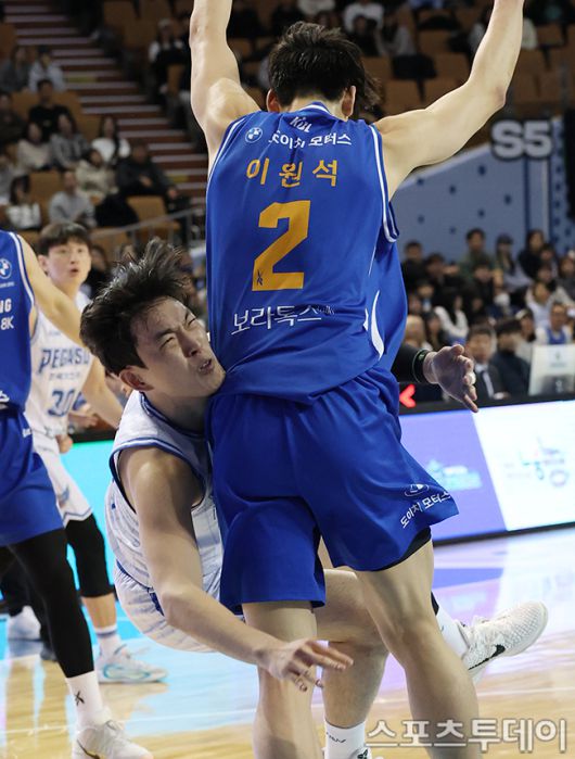 [스포츠투데이 권광일 기자] 2025-2026 LG전자 프로농구 서울삼성와 대구한국가스공사의 경기가 22일 서울 잠실실내체육관에서 열렸다. 가스공사 신승재가 삼성 이원석과 충돌하고 있다. 2026.01.22. [스포츠투데이 권광일 기자 sports@stoo.com]