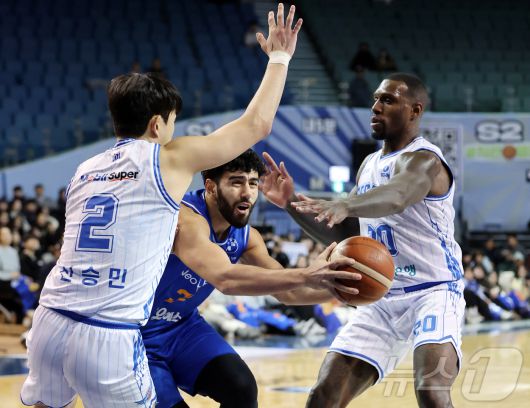 (서울=뉴스1) 김진환 기자 = 22일 오후 서울 송파구 잠실 잠실실내체육관에서 열린 2025-2026 LG전자 프로농구 정규리그 서울 삼성 썬더스와 대구 한국가스공사의 경기, 4쿼터 삼성 칸터가 한국가스공사 신승민, 라건아 수비 앞으로 돌파하고 있다. 2026.1.22/뉴스1