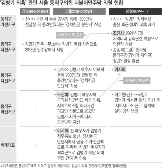 2024년 7월 의원직을 잃은 조 전 구의원 지역구는 지난해 4월 보궐선거로 송동석 구의원이 물려받았다. 그는 김 의원이 위원장인 민주당 동작구갑 지역위원회 청년위원장 출신이다.