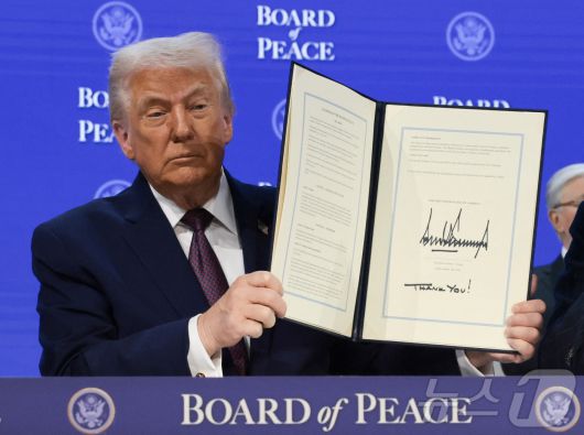 평화위원회 헌장에 서명한 뒤 들어보이는 트럼프 미국 대통령. 2026.01.22 ⓒ 로이터=뉴스1 ⓒ News1 이지예 객원기자 |