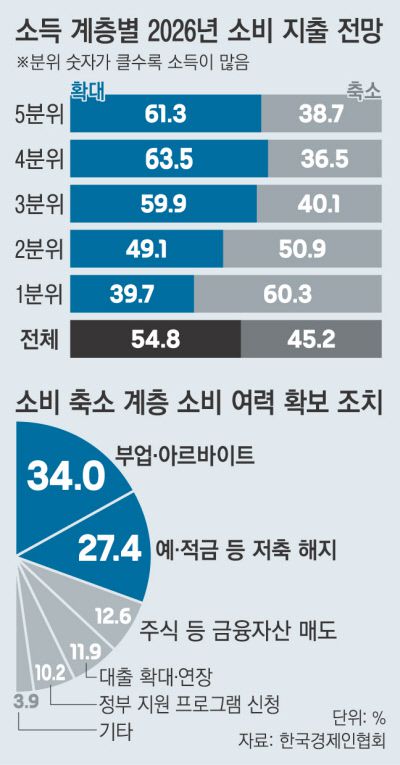 소득 분위별로 보면, 소득 상위 60%(3~5분위)는 올해 소비를 지난해보다 늘릴 것이라고 답했다. 고소득층의 경우 주식 등 자산가치 상승이 소비 심리 개선에 일정 부분 영향을 준 것으로 한경협은 분석했다. 반면 소득 하위 40%(1~2분위)는 줄이겠다고 답했다.