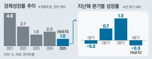 한은은 지난해 4분기 실질 국내총생산(GDP) 성장률(속보치·직전 분기 대비)이 -0.3%로 집계됐다고 22일 밝혔다. 이는 지난해 11월 제시한 성장률 전망치(0.2%)보다 0.5%포인트 낮은 수준으로, 2022년 4분기(-0.4%) 이후 3년 만에 가장 부진한 분기 실적이다.
