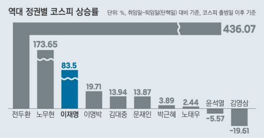 노무현 정부 당시 코스피가 173.65% 상승해 유일하게 ‘세 자릿수 성장’했고, 이재명 정부도 현재까지 약 83.5% 상승해 뒤를 이었다.