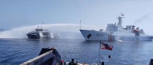 스카버러 암초 인근 해역에서 충돌을 벌이고 있는 중국과 필리핀의 해경. 대체로 필리핀이 중국에 밀리는 경우가 많다. 필리핀이 충분히 반감을 가질 만하다고 해야 할 것 같다./환추스바오(環球時報). |