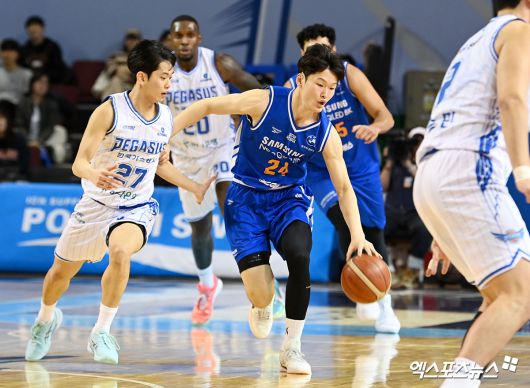(엑스포츠뉴스 잠실, 고아라 기자) 22일 오후 서울 송파구 잠실실내체육관에서 열린 2025-2026 LG전자 프로농구 서울 삼성과 대구 한국가스공사의 경기, 서울 삼성이 92:85로 승리를 거뒀다. 삼성 신동혁이 돌파를 시도하고 있다.고아라 기자 iknow@xportsnews.com
