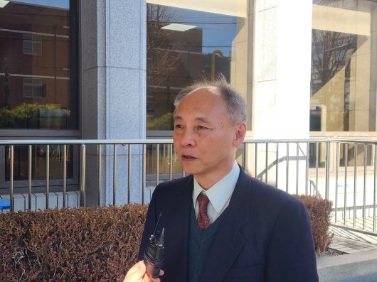 22일 국가보안법 위반 혐의 재심 재판에서 무죄를 선고받은 뒤 인터뷰하고 있는 문영석씨. |