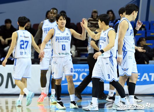 (엑스포츠뉴스 잠실, 고아라 기자) 22일 오후 서울 송파구 잠실실내체육관에서 열린 2025-2026 LG전자 프로농구 서울 삼성과 대구 한국가스공사의 경기, 서울 삼성이 92:85로 승리를 거뒀다. 가스공사 벨란겔, 정성우가 득점한 뒤 기뻐하고 있다.고아라 기자 iknow@xportsnews.com