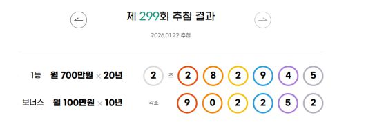 2026년 1월 22일 제299회 연금복권720+ 추첨이 진행됐다. 1등 당첨번호는 2조 2 8 2 9 4 5로 확인됐다. 보너스 번호는 각조 9 02 2 5 2다.