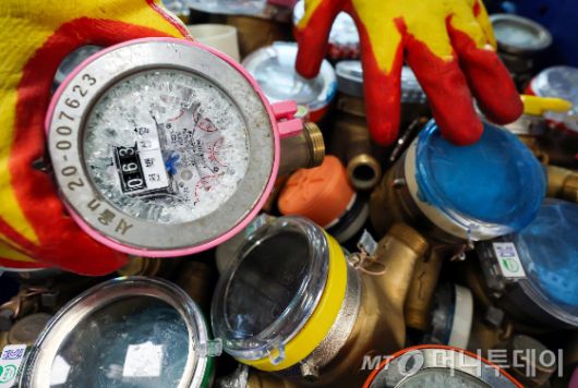 서울 전역에 한파주의보가 내려진 21일 서울 강북구 서울북부수도사업소에서 수도계량기 교체반 직원이 동파된 수도계량기를 정리하고 있다./사진제공=뉴스1 |