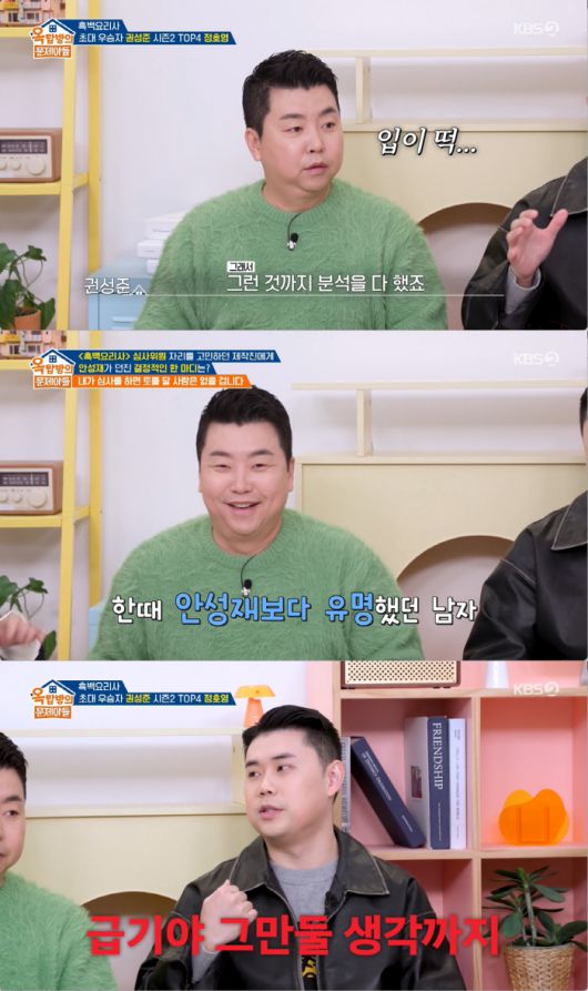 22일 방송된 KBS 2TV '옥탑방의 문제아들'(이하 '옥문아')에는 넷플릭스 시리즈 '흑백요리사2' TOP4 정호영 셰프와 '흑백요리사1' 나폴리맛피아 권성준 셰프가 출연했다.