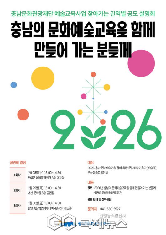 (충남=국제뉴스) 박의규 기자 = 충남문화관광재단(대표이사 이기진)은 2026년 도민 누구나 더 가까이, 더 깊게 누리는 충남 문화예술교육에 함께 할 도내 문화예술교육가 및 문화예술교육단체 대상 사업 공모를 오는 2월 20일(금)까지 진행한다.