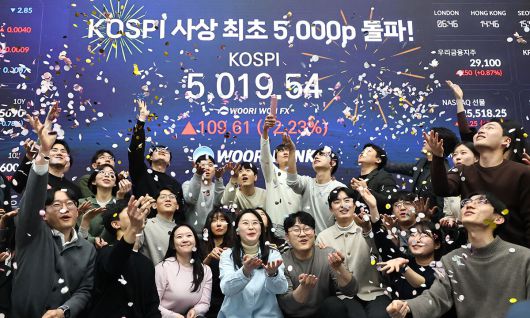 코스피가 사상 처음으로 ‘5000시대’를 목전에 뒀다가 후퇴했다. 어제 코스피는 전장보다 42.60포인트(0.87%) 오른 4952.53으로 마감됐다. 장중 한때 5019.54까지 올랐다가 차익 실현 매물에 5000선 등극에 실패했다. 하지만 지난해 10월 4000선을 넘어선 지 3개월 만에 파죽지세로 5000선을 터치한 건 고무적이다. 삼성전자·SK하이닉스를 필두로 한 반도체가 시장을 이끌고 정부의 강력한 밸류업 지원, 글로벌 증시 훈풍이라는 ‘3박자’가 맞아떨어진 게 주효했다. 미국의 유럽을 상대로 한 그린란드 관세를 철폐한 것도 호재로 작용했다. ‘국장 탈출은 지능 순’이라던 때와 비교하면 격세지감이지만 샴페인을 터트리기엔 이르다.