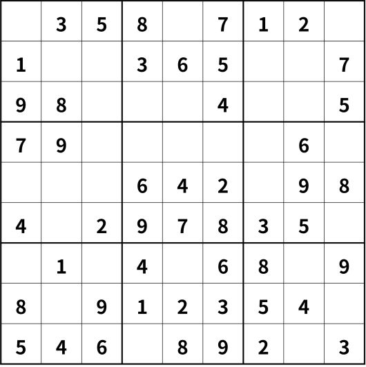 ※ 스도쿠 규칙: 숫자 1~9를 ①세로 9칸에 한 번씩만 써서 채운다. ②가로 9칸에도 한 번씩만 써서 채운다. ③굵은 선의 작은 사각형 3칸×3칸에도 한 번씩만 써서 채운다.