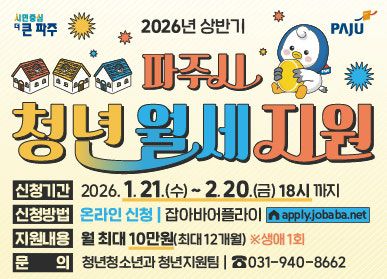 경기도 파주시는 주거비 부담으로 어려움을 겪고 있는 19~39세 청년 가구를 대상으로 월 최대 10만 원씩 최대 12개월간, 총 120만 원의 월세를 지원한다.