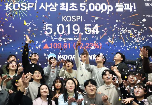코스피 지수가 장중 사상 처음으로 5,019.54를 기록한 22일 서울 중구 우리은행 본점 딜링룸에서 딜러들이 코스피 지수 5,000선 돌파를 축하하고 있다./연합뉴스 |