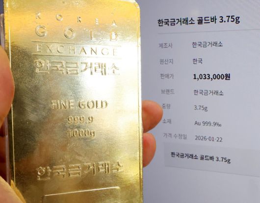22일 서울 종로구 한국금거래소 종로본점에서 직원이 골드바를 들어 보이고 있다. 한국금거래소에 따르면 21일 기준 순금 한 돈(3.75g) 매입가는 100만9000원으로 사상 처음 100만 원을 넘겼다. 뉴시스 Copyright Ⓒ 동아일보. All rights reserved. 무단 전재, 재배포 및 AI학습 이용 금지