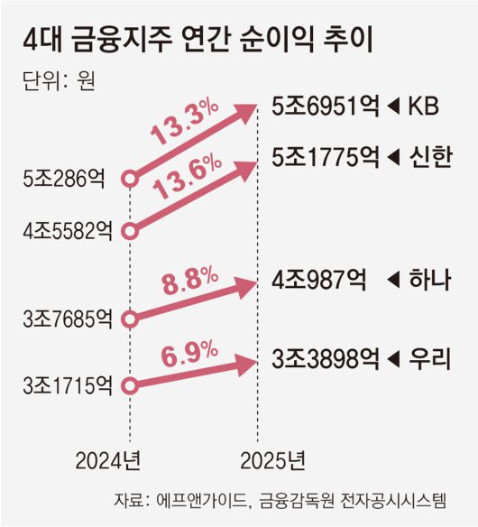 22일 금융정보업체 에프앤가이드에 따르면 4대 금융그룹(KB·신한·하나·우리)의 2025년 연간 순이익은 18조3610억 원으로 예상된다. 2024년(16조5268억 원)보다 11.1% 늘어난 규모다.