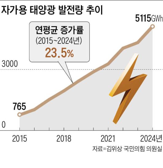 기후에너지환경부가 김위상 국민의힘 의원실에 제출한 자료에 따르면, 국내 자가용 태양광 설비 용량은 2015년 671MW(메가와트)에서 2024년 4620MW로 약 7배 늘었다. 같은 기간 발전량도 765GWh(기가와트시)에서 5115GWh로 7배가량 증가했다. 전국 128만 가구(4인 기준)가 1년 동안 사용할 수 있는 전력량이다.