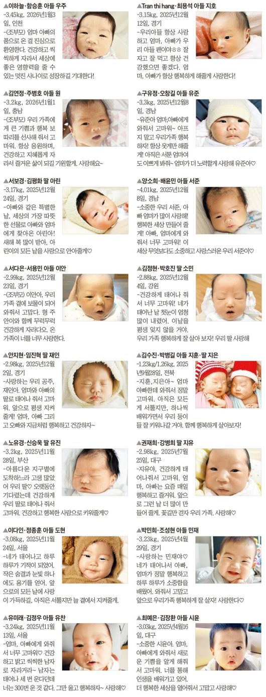 온 가족에게 기쁨을 안겨 준 아기의 탄생을 알려주세요. 홈페이지 주소 입력창에 아가야안녕.com이라고 입력하면 됩니다. 매일유업 육아 정보 사이트 매일아이(maeili.com)를 통해서도 접속할 수 있습니다. 추첨을 통해 출산 소식과 사진이 지면에 실린 가족에게는 ①케이크 구매권 ②엄마와 아이를 위한 매일두 포인트 3만원 ③출산 소식을 생일 날짜 본지 1면에 담은 PDF 파일 ④조선일보 1개월 무료 구독권을 드립니다. 당첨자 중 한 가족을 선정하여 해당 지면을 고급 프레임에 담아 제공하는 조선일보 리프린트도 제작해 드립니다. 홈페이지에서는 균형 영양식 메디웰 2만원 할인 혜택도 드리고 있습니다.