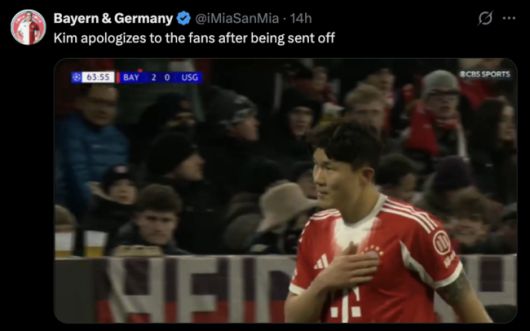 [OSEN=노진주 기자] 선발 출전한 김민재(29, 바이에른 뮌헨)가 후반 중반 퇴장당하면서 팀이 2025-2026시즌 유럽축구연맹(UEFA) 챔피언스리그(UCL) 16강행을 확정 하는 것을 그라운드 밖에서 지켜봐야 했다. 오히려 팬들은 그를 격려했다.