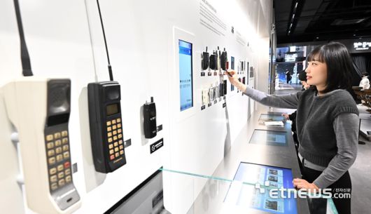 KT의 통신기술의 역사를 체험할 수 있는 'KT 온마루'가 이색 체험공간으로 인기를 끌고 있다. 통신사료를 활용해 체험형으로 즐길 수 있는 '시간의 회랑', 몰입형 미디어 아트를 감상할 수 있는 '빛의 중정', 주기적으로 새롭게 변화하는 팝업 공간 '이음의 여정'으로 구성된 온마루는 월요일부터 토요일까지 상시 무료 개방되며 사전 예약을 통해 도슨트 투어도 가능하다. 방문객이 2G폰을 살펴보고 있다.