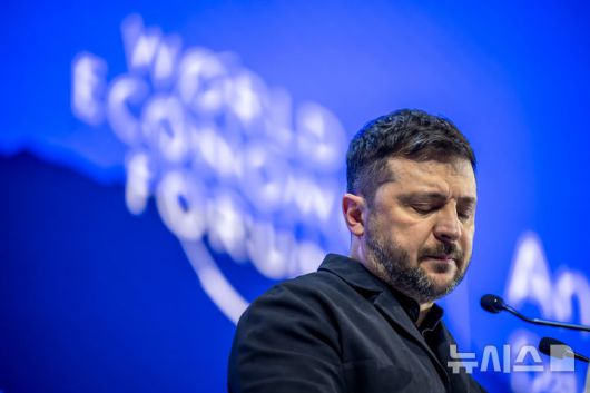[다보스=AP/뉴시스] 볼로디미르 젤렌스키 우크라이나 대통령이 22일 스위스 다보스 세계경제포럼(WEF)에서 연설하고 있다. 2026.01.23. |