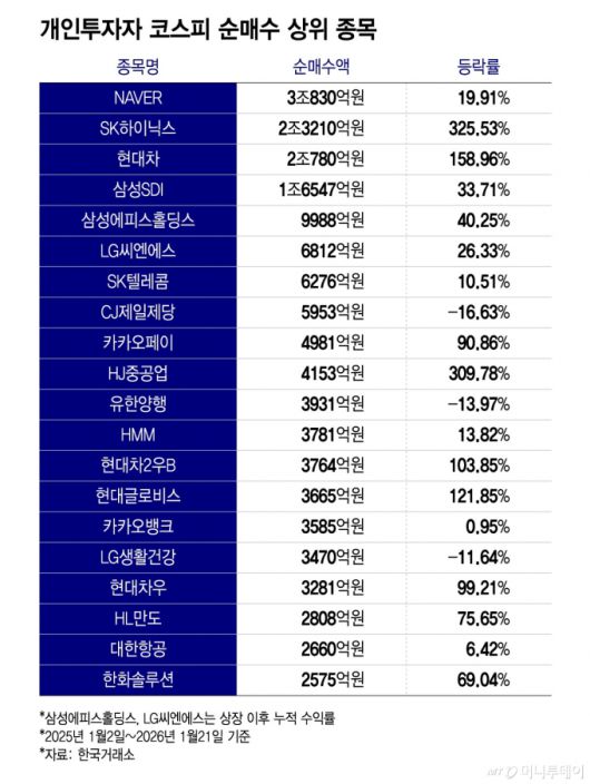 개인투자자 순매수 1위 종목은 네이버로 순매수액은 3조830억원이다. 이 기간에 수익률은 19.91%에 불과했다. 순매수 상위 2위, 3위 종목은 각각 SK하이닉스(순매수액 2조3210억원)와 현대차(2조780억원)다. SK하이닉스와 현대차의 수익률은 각각 325.53%와 158.96%로 코스피 상승률을 상회했으나 순매수 상위 4위인 삼성SDI(1조6547억원)의 수익률은 33.71%에 그쳤다.