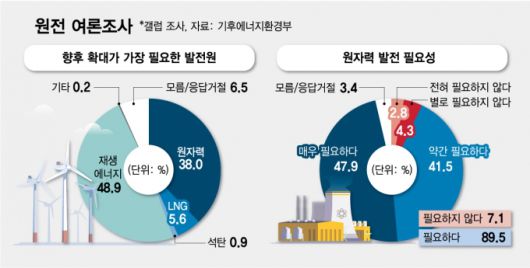 갤럽 기준 원자력발전이 '필요하다'는 응답이 89.5%에 달했다. 신규원전이 '추진돼야 한다'는 의견도 69.6%다. 동시에 '향후 확대가 가장 필요한 발전원'으로는 재생에너지가 48.9%로 원전 38%보다 높았다.