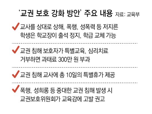 앞으로 교사를 때리는 등 교권을 크게 침해한 학생은 시도교육청 교권보호위원회(교보위)의 처벌 결정이 나오기 전에 학교장 재량으로 출석 정지 등의 처분을 받는다. 교권을 침해한 학부모가 심리치료 등을 받지 않으면 과태료 300만 원을 일괄 부과하는 방안도 추진된다.