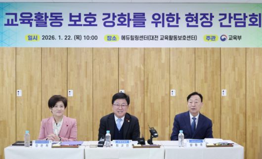 최교진 교육부 장관이 22일 대전 에듀힐링센터에서 강은희 교육감협의회장(대구시교육감), 설동호 대전교육감, 교사, 학부모들과 ‘교육활동 보호 강화 방안’‘을 주제로 현장간담회를 하고 있다. 2026.1.22 교육부 제공 |