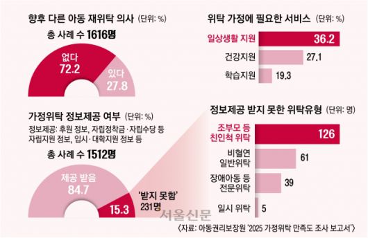 서울신문이 입수한 아동권리보장원의 ‘2025 가정위탁 만족도 조사’에 따르면 위탁부모 1616명 중 72.2%는 향후 다른 아동을 다시 위탁할 의사가 없다고 답했다. 응답자 1512명 가운데 231명(15.3%)은 후원 정보나 아동 자립 지원 정보 등 기본적인 안내조차 받지 못했다고 밝혔다.