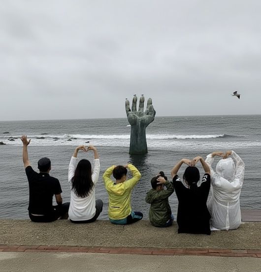 경북 포항 호미곶 해맞이광장 ‘상생의 손’ 조형물 앞에서 위탁부모 이현정씨 가족이 기념촬영을 하고 있다. 가운데 두 아이가 이씨가 돌보는 위탁 아동이다. 이현정씨 제공 |