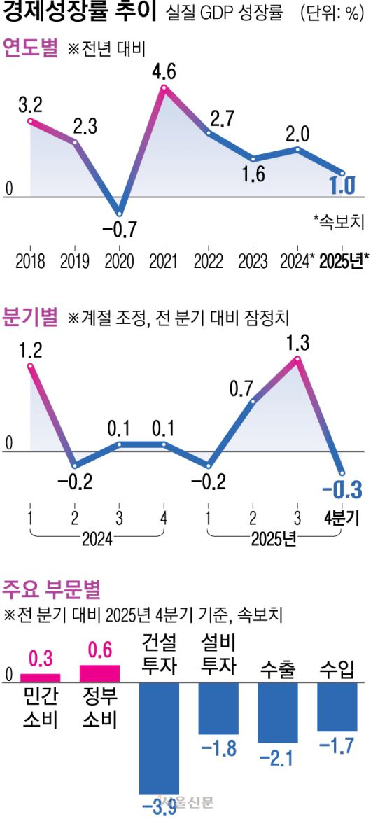 특히 4분기 성장률 -0.3%는 한은 전망치보다 0.5% 포인트 낮은 수치로 ‘어닝쇼크’(실적 충격) 수준이다. 분기 기준으로 GDP가 감소한 것은 3분기 만이고, 감소 폭으로는 2022년 4분기(-0.4%) 이후 가장 크다. 직전 분기 1.3%의 ‘깜짝 성장’에 따른 기저효과와 함께 건설경기 급락이 결정타였다.