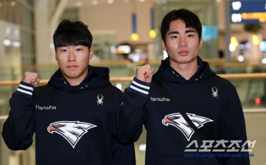 한화 이글스 선수단이 23일 인천국제공항을 통해 스프링캠프가 열리는 호주로 출국했다. 최유빈, 오재원이 포즈를 취하고 있다. 인천공항=박재만 기자 pjm@sportschosun.com/2026.01.23/