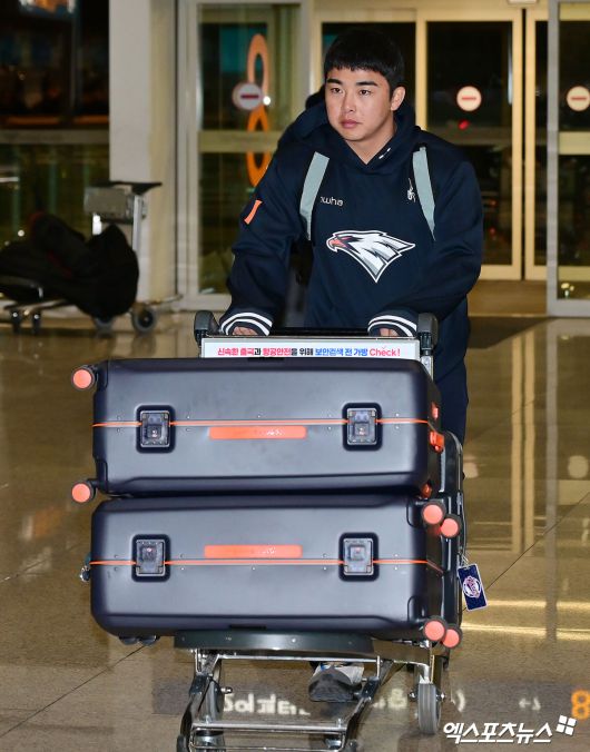 (엑스포츠뉴스 인천공항, 김한준 기자) 2026시즌 스프링캠프 훈련에 나서는 한화 이글스 선수단이 23일 오전 인천국제공항을 통해 호주 멜버른으로 출국했다. 출국장으로 향하는 한화 문현빈.김한준 기자 kowel@xportsnews.com
