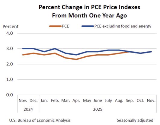 미 상무부 경제분석국(BEA)은 22일(현지시간) 지난해 11월 PCE 가격지수가 전년 동월 대비 2.8% 상승했다고 발표했다. 10월 PCE 가격지수는 전년 대비 2.7% 상승했다.
