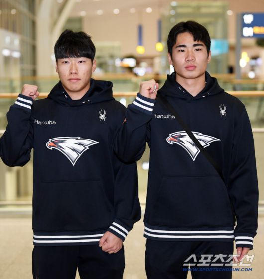 한화 이글스 선수단이 23일 인천국제공항을 통해 스프링캠프가 열리는 호주로 출국했다. 최유빈, 오재원이 포즈를 취하고 있다. 인천공항=박재만 기자 pjm@sportschosun.com/2026.01.23/ |