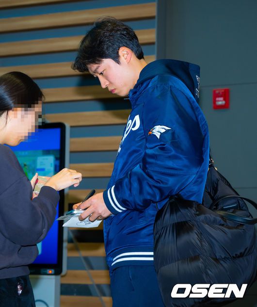 [OSEN=인천공항, 민경훈 기자] 프로야구 한화 이글스가 2026 시즌을 준비하기 위해 23일 오전 인천공항을 통해 호주 멜버른으로 1차 스프링캠프를 떠났다. 김경문 감독이 이끄는 한화 선수단은 코치진 17명, 선수 46명을 합해 63명으로 1차 스프링캠프 명단을 꾸렸다. 한화 엄상백이 출국길에 오르며 팬들에게 사인을 해주고 있다. 2026.01.23 / rumi@osen.co.kr
