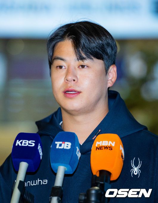[OSEN=인천공항, 민경훈 기자] 프로야구 한화 이글스가 2026 시즌을 준비하기 위해 23일 오전 인천공항을 통해 호주 멜버른으로 1차 스프링캠프를 떠났다. 김경문 감독이 이끄는 한화 선수단은 코치진 17명, 선수 46명을 합해 63명으로 1차 스프링캠프 명단을 꾸렸다. 한화 노시환이 출국길에 오르며 인터뷰를 하고 있다. 2026.01.23 / rumi@osen.co.kr