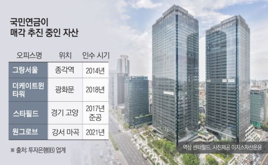 강북 오피스 자산에 대해서는 투자회수(엑시트) 단계에 들어갔다. 시장에서는 국민연금이 올해 매각에 나설 후보군으로 종각 그랑서울, 광화문 더케이트윈타워, 고양 스타필드, 마곡 원그로브 등을 꼽는다. 이 가운데 그랑서울과 더케이트윈타워는 연내 매각이 목표다. 국민연금은 다음 달부터 더케이트윈타워 매각 주관사 선정을 위한 제안요청서(RFP)를 발송하고, 본격적인 매각 절차에 들어갈 것으로 알려졌다.