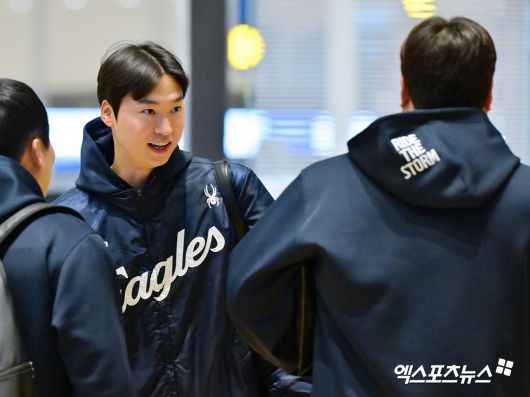 (엑스포츠뉴스 인천공항, 김한준 기자) 2026시즌 스프링캠프 훈련에 나서는 한화 이글스 선수단이 23일 오전 인천국제공항을 통해 호주 멜버른으로 출국했다. 출국 전 한화 엄상백이 류현진과 대화를 나누고 있다.김한준 기자 kowel@xportsnews.com