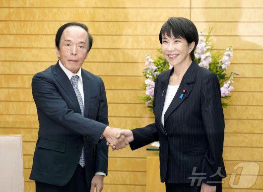18일 다카이치 사나에 일본 총리가 도쿄의 총리 관저에서 우에다 가즈오 일본은행 총재와 회동하고 있다. 2025.11.18. ⓒ 로이터=뉴스1 |