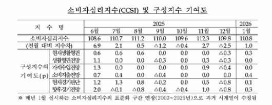 1월 소비자심리지수(CCSI)는 국내경제 개선 흐름 지속, 정부 경제 성장 전략에 대한 기대감으로 전월 대비 1.0p 소폭 상승한 110.8을 기록했다.