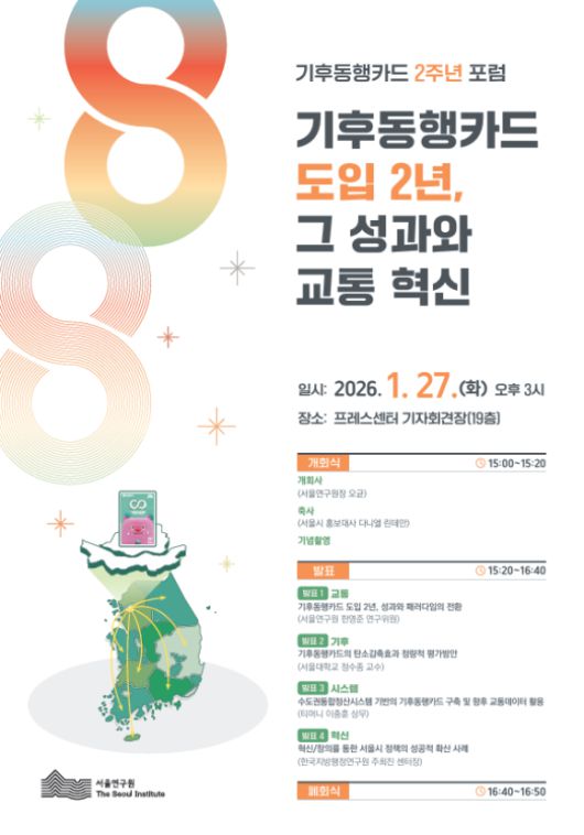 [더팩트ㅣ정소양 기자] 서울연구원은 오는 27일 한국프레스센터에서 기후동행카드 도입 2주년을 맞아 정책 포럼을 연다고 23일 밝혔다.