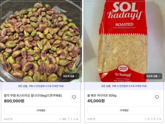 이렇다 보니 미리 매집한 재료를 비싼 값에 되파는 ‘리셀’ 움직임도 포착된다. 이날 주요 개인 간 중고 거래 플랫폼에서 볶은 카다이프나 탈각 피스타치오는 1㎏당 10만 원에 육박하는 가격에서 거래됐다. 게시물들은 주로 “한 번에 50㎏까지 대량 구매도 얼마든지 가능하다”는 점을 내세운다. 한 개인 카페 운영자는 “소고기보다 비싼 값을 주고 재료를 사야 하지만 이전까지 매출 상승에 직접적인 효과를 본 사례가 많다 보니 안 만들 수도 없는 상황”이라고 말했다.