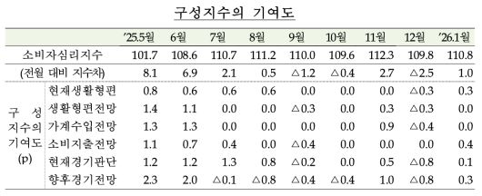 1월 소비자심리지수(CCSI)가 110.8로 전월보다 1.0포인트(p) 상승했다. 국내경제 개선 흐름과 정부 경제성장전략에 대한 기대가 심리를 끌어 올렸지만, 취업기회 전망은 되레 낮아지는 등 지표별 온도차가 나타났다.