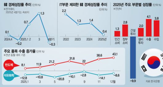 우리 경제가 체면치레를 한 것은 반도체 수출 호황 덕분이다. 건설투자가 전년 대비 9.9%나 감소한 가운데 정부 재정지출 확대로 민간소비가 소폭 늘면서 성장률 하락을 막았다. 한편 지난해 4분기 실질 국내총생산(GDP)은 전기 대비 0.3% 감소했다. 지난해 1분기(-0.2%) 이후 3분기 만에 역성장이자 2022년 4분기(-0.4%) 이후 3년 만에 가장 큰 감소 폭이다.우리나라가 지난해 가까스로 1%의 성장률을 달성했지만 성장의 질적 취약성에 대한 우려가 커지고 있다. 반도체 등 정보기술(IT) 제조업에 성장 동력이 과도하게 집중되고 다른 부문은 더 악화되는 ‘외줄 성장’ 구조가 두드러지고 있기 때문이다. 전문가들은 반도체 경기가 꺾이면 전체 성장률이 휘청거릴 수 있다며 경계심을 나타냈다.